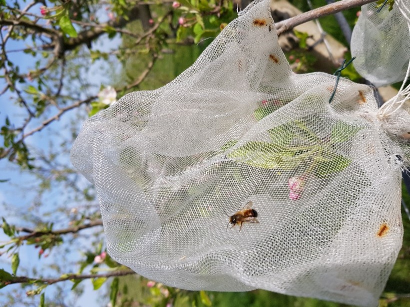 Pour étudier ces paramètres, une méthode consiste à exclure délibérément les pollinisateurs en plaçant des sacs en maille fine sur certaines fleurs, empêchant ainsi les insectes d’y accéder. En comparant les résultats de cette condition avec celles où les fleurs ne sont pas couvertes, il devient possible de comprendre l’importance des insectes dans la pollinisation des pommiers et, par conséquent, dans la production de fruits.