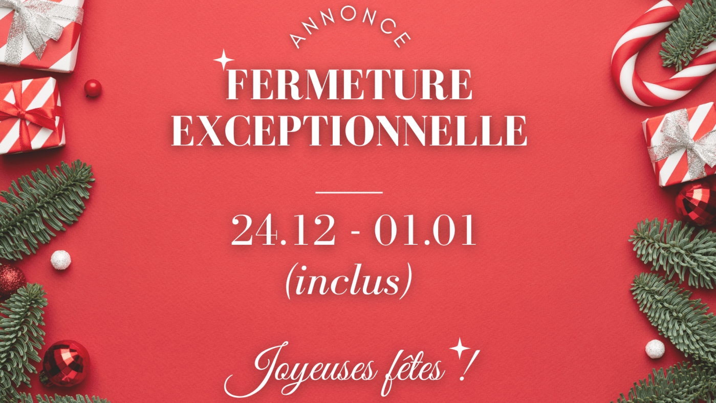 À l’occasion des fêtes, nous serons exceptionnellement fermées du 24 décembre au 01 janvier (inclus).