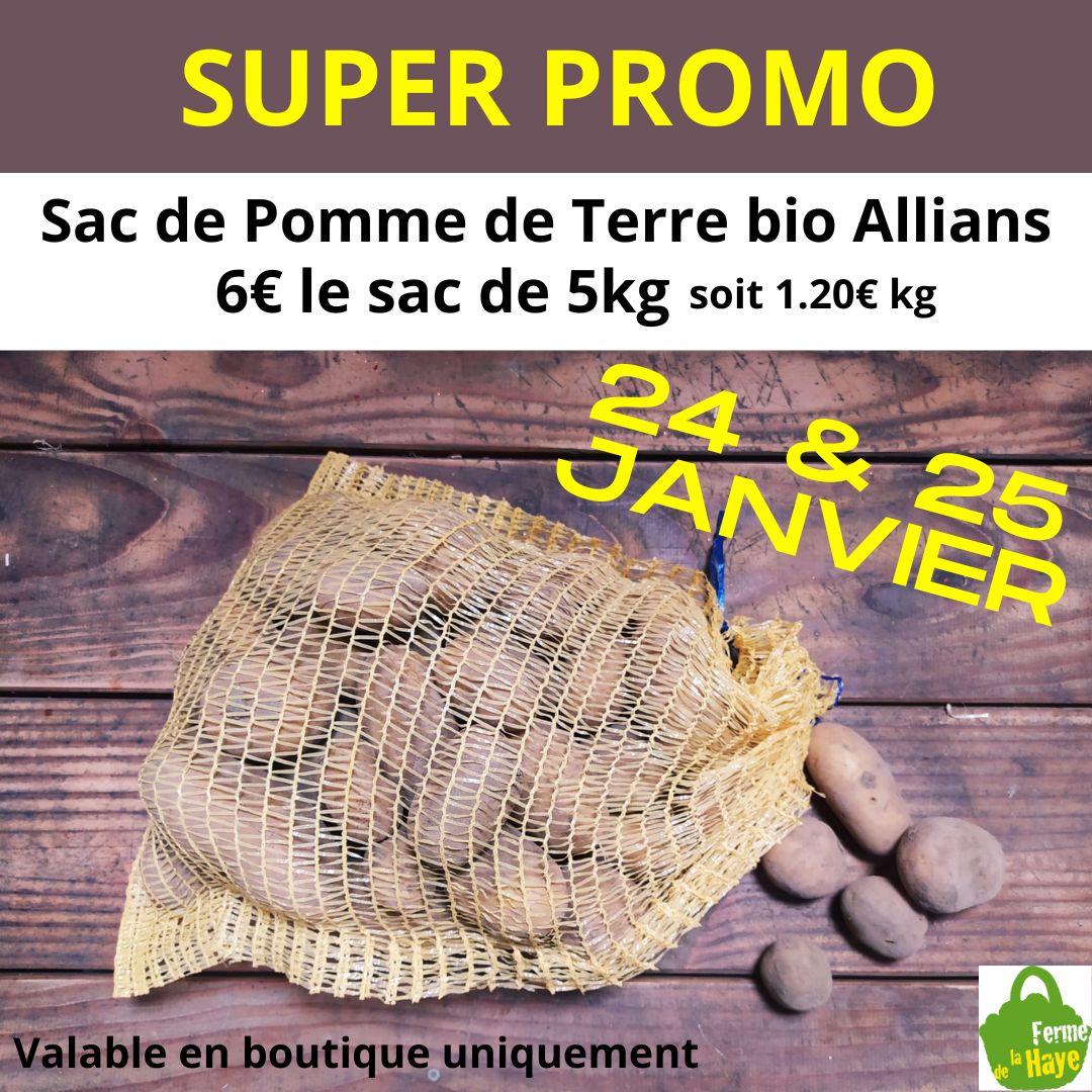 Ce weekend, le sac de 5 Kg de pomme de terre type Allians (chair ferme) est au prix de 6€ (soit 1.20€kg) au lieu de 7.50€.